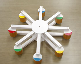 2.キャビンのフレーム(2つ作ります) (7)(9)の軸を通す位置に穴をあけます。 円板(1)の中心に軸を通す穴をあけます。厚さ12mmの板に同じ穴をあけ、使ったドリルを立てます。これに型紙を置きます。この上に(7)(9)を置き、円板(1)と接着する部分に接着材を塗ります。円板を置き(7)(9)の位置を調整します。円板の上から当て板を置き、接着剤が乾くまでクランプで固定します。 注意:もでりん図面では円板(1)は丸棒になっていますが、シナベニア3mmを使います(台(2)と同じ材料)。
